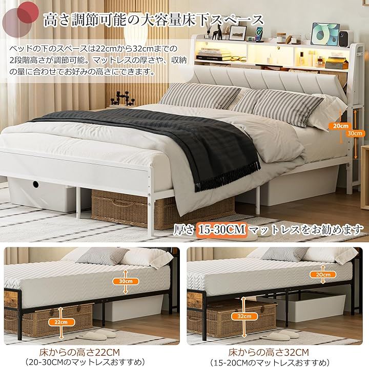 「商品仕様」*商品サイズ(cm):幅140x奥行212x高さ98cm *対応マットレスサイズ:ダブルサイズ(幅140x長さ195cm)*商品重量:約32kg *梱包サイズ:148x43.5x14.5CM *梱包重量:35kg *材質:本体/スチール(粉体塗装)棚板/MDF *耐荷重:本体/約350kg ヘッド部棚/約20kg *カラー:ブラック/ホワイト/ビンテージ 組立品/完成品:組立品(2人で組立て時間約45分)。