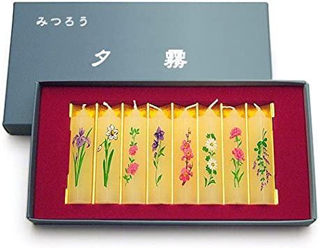 寸法:長さ6cm×径1cm/箱寸法:縦9.5cm×横18cm×高さ2cm/燃焼時間:約40分/本数:8本入り季節の花の絵の入った四角い蜜蝋入り絵ローソクです。親しい方へのお土産に、心ばかりの贈り物に最適です。本当に良いローソクをお探しの方に最適な蜜蝋入り絵ろうそくです。ミツバチの蜂の巣からとれる蜜蝋は、現在でも大変高価なためあまり使われておりませんが、蜜蝋を含むローソクの炎は大変美しく、見る人に感動さえ与えます。油煙が少なく、本当に美しい炎のローソクです。