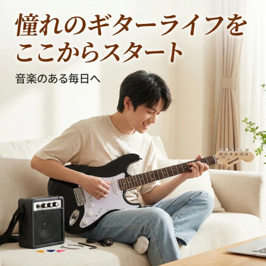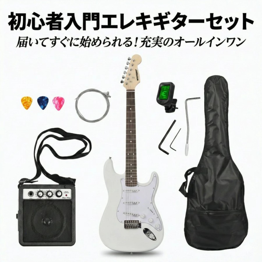 そんな方にぴったりの、初心者入門エレキギター10点セットです。ギター本体に加え、練習に欠かせないミニアンプやソフトケース、チューナー、シールドケーブルなど、必要アイテムをまとめてセット化。届いたその日からすぐに練習をスタートできます。