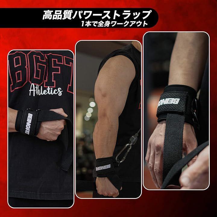 パワーグリップで握力サポート: 高強度ナイロン製ストラップでバーやグリップをしっかり固定。
