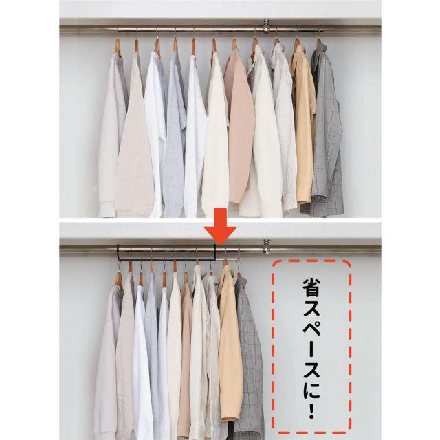 ・衣類の収納量アップ、吊るすだけの簡単設置。・衣類を段違いに収納することで、肩部分の厚みを減らして省スペースに収納できます。・直径4cmまでのポールに設置できます。・幅が45~70cmに伸縮するので、収納場所に合わせて設置することができます。・製品の幅を調節する際、ワイヤーの線以上に広げると,強度が弱くなりますので、線以上は広げないでください。