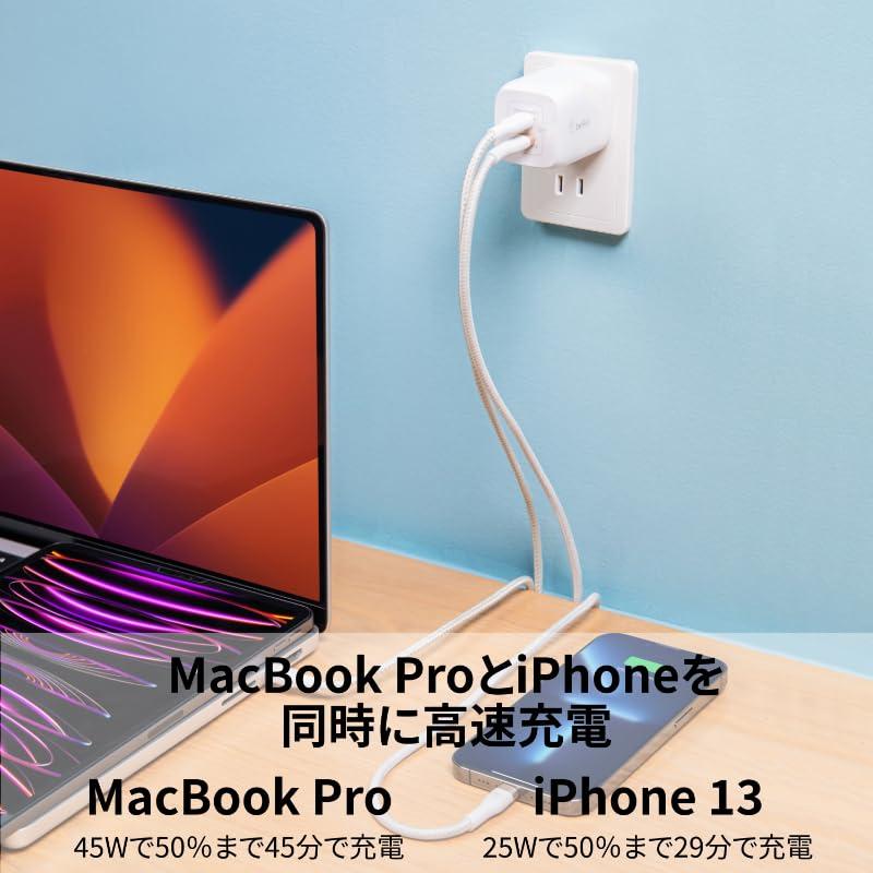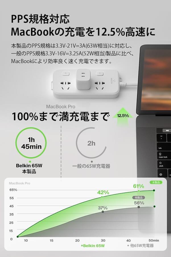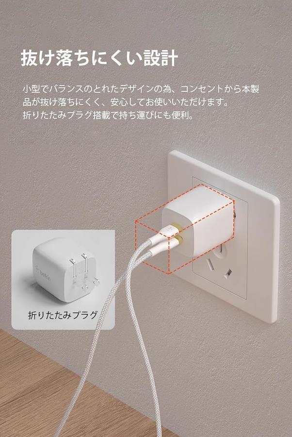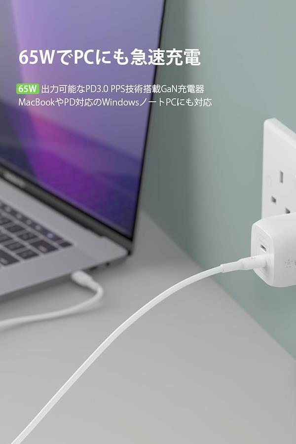 【PPS規格対応】PPS(Programmable Power Supply)テクノロジーは、接続されたデバイスに応じて充電器の出力電圧をダイナミックに調整するので、ノートPCやスマホを高速かつ安全に充電し、充電中の発熱または過充電を防ぎます。BelkinのPPS技術は3.3V-21Vまで対応可能で、他社の3.3V-16Vの対応範囲と比べ、MacBookの充電時間が15%速くなります