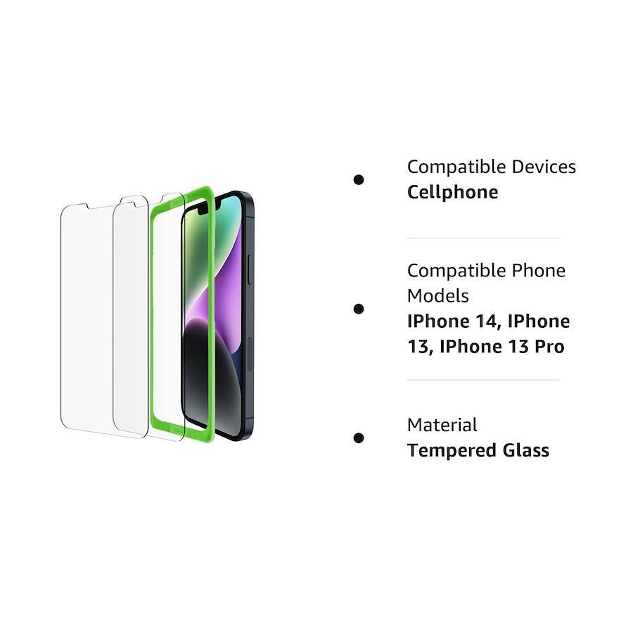 3営業日以内に発送≪新品未開封品≫:お買い得2枚セット/iPhone 14 / 13 / 13 Pro用のスクリーン保護フィルム・強化ガラス/【硬度9Hの耐衝撃強化ガラス「日本AGC旭硝子」を採用】4層構造で最も安心、より強い耐久性と弾力性を実現。/【極薄0.33mmガラスでより高い透過性】指紋防止、傷防止、高い透明度、高いタッチ感度。/【付属の「EZ Alignフレーム」で、かんたんにキレイに貼れるを実現】気泡の発生や位置ズレを防止。/日本語サポート/【取り付け時のご注意】タブ1のフィルムの面がオモテ面になります。タブの2のフィルムの面をiPhoneに貼り付けてください。