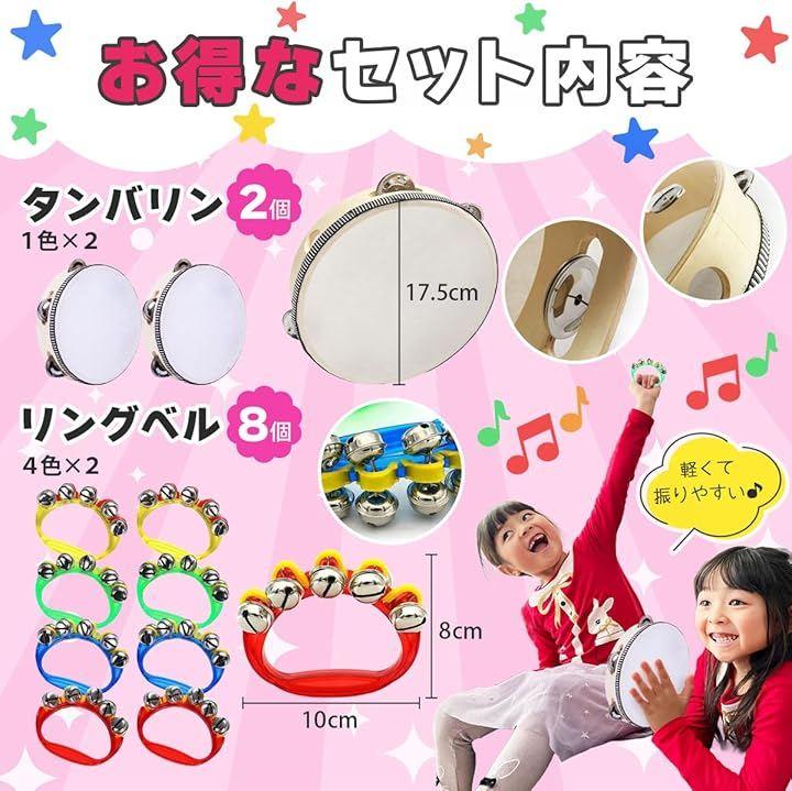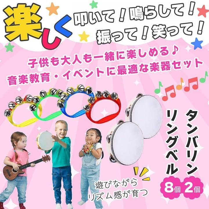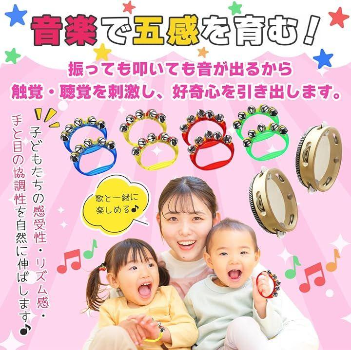 「商品詳細」*セット内容:タンバリンx2(直径約17.5cm)、リングベルx8(レッド・ブルー・グリーン・イエロー 各2個)*リングベルサイズ:約10x8cm *材質:タンバリン/木材・金属、リングベル/プラスチック・金属 *用途:リトミック、音楽教育、発表会、学校行事、パーティー、リズム遊び *対象年齢6歳以上