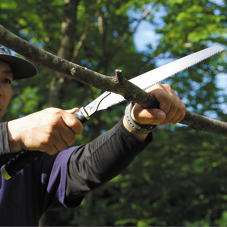 重量180g(収納ケース含む)のウルトラライト仕様のノコギリです。 超軽量ですが、刃渡りが240mmなので太い薪でも切ることができます。一般的なノコギリよりも刃の角度をつけてあるので力が入りやすく、目線より高い木でも楽に作業できます。 渓流釣り、沢登りなど、山の中でテント泊する際に。荷物を極力軽くしたいULキャンパーの方に。