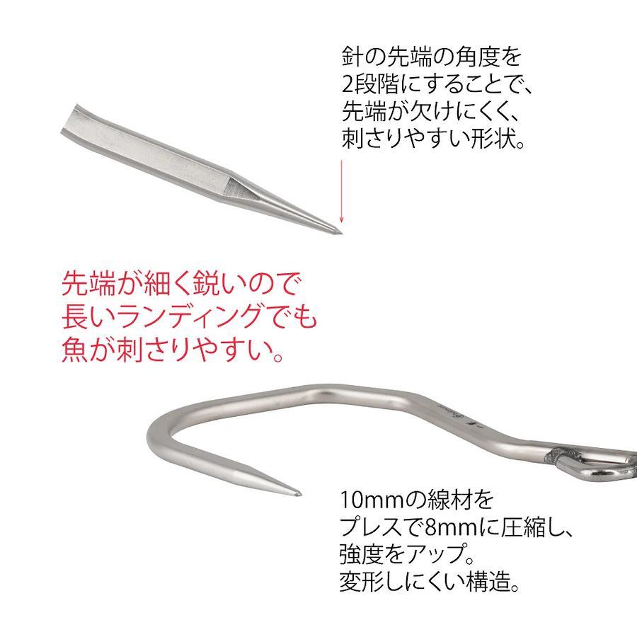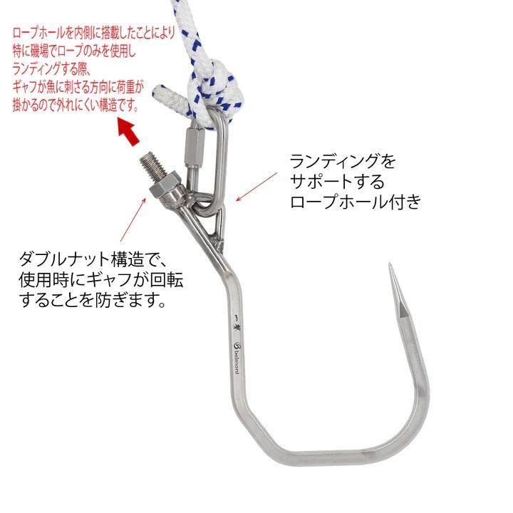 マグロ、カジキ、クエなどの大型の魚に対応するビッグゲームギャフ。掛けた魚をランディングしやすく、逃がしにくい形状。素材は強度が高く、錆に強い18-8ステンレスを採用。ロープホールを内側に搭載したことにより、特に磯場でロープのみを使用しランディングする際、ギャフが魚に刺さる方向に荷重が掛かるので外れにくい構造です。材質/18-8ステンレスサイズ/約H275×W150、線径11×8mm重量/約340g垂直耐荷重/160kgネジ径/4分MADE IN JAPAN