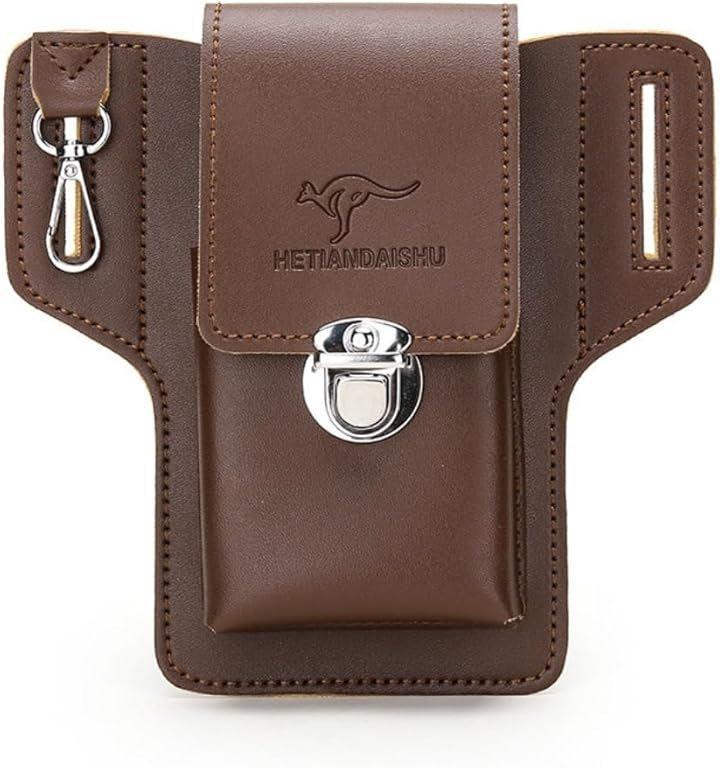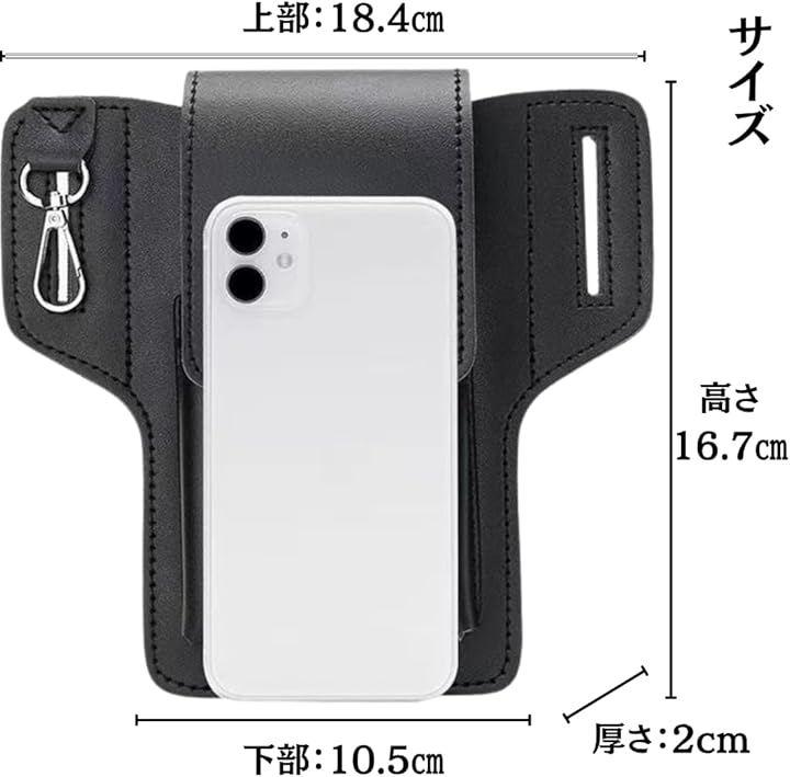 「製品仕様」サイズ(縦x横x厚さ):上部約18.4x下部10.5x高さ16.7x厚さ2cm (収納部分) 重量:約100g 素材:PUレザー、合成皮革 使用用途:スマホ、タバコ、クレカ、現金、鍵などの持ち運び