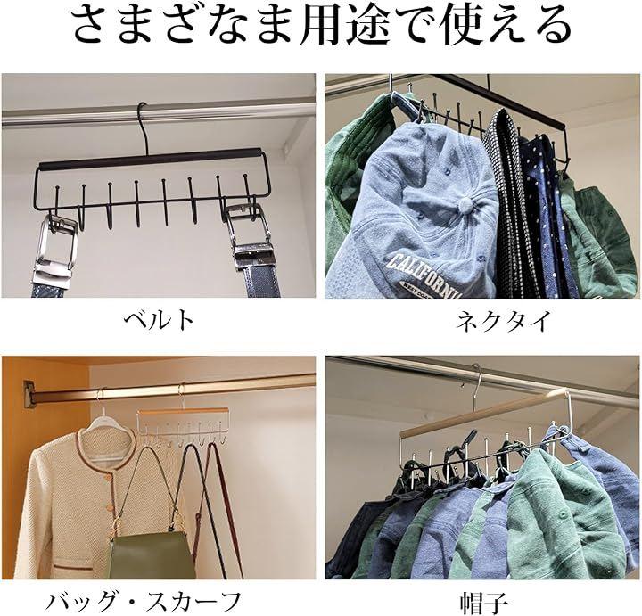 マルチ収納対応: ベルトだけでなく、ネクタイ・帽子・スカーフ・バッグなども掛けられるハンガー。