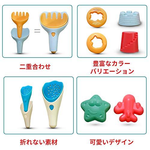 【超豪華な17pcs砂場遊びセット】 車、ふるい、スコップ、砂ふるい、バケツ、キッズ、ビーチ、砂型、じょうろと砂時計合計17pcs子供おもちゃです。使いやすいように工夫された丸みのあるデザインで、子供が水、砂、雪、粘土などで自由に遊び、赤ちゃんのおもちゃとして室内・屋外兼用です。 【安全な素材&優良な品質】 厳しい品質基準を採用する安全な素材で、子供が噛んでも大丈夫です。手に優しい高品質のPP材料とABS樹脂で作られ、柔らかいくて扱いやすいのに、厚みがあり、本体折れることがなく、紫外線による劣化にも長時間耐えます。 【収納袋付き&持ち運び便利】 収納用のメッシュバッグはおもちゃ部品全部いれられて、夏休み公園や海へ行く時は持ち運び便利で、遊んだ後にお子さまが片付けやすく、おもちゃの紛失も防ぎます。 【無限の遊び方】 砂場、ビーチなどの海辺と室外だけでなく、天候と季節を問わず、お風呂、お庭、雨の日に室内で遊んでもよろしいです。豊富なカラーバリエーションで、色もカラフルで可愛くて、一瞬間子供の注意力を吸い込み、お気に入りのお友達を見つけて、子供は大人の真似をして自分の役割分担を考えることで、社会性を身につけていき、無限の遊び方を探索し、お砂場遊び・水遊び・お風呂遊び・雪遊びなどが充分に楽しくごっこ遊び! 【夏に最高のプレゼント!】 パーツ多いので、この夏に最高なプレゼントです!また、保証期間はお買い上げ日より90日間となりますが、保証期間内の正常使用によって生じた故障または損傷に対して、無償交換&返品を承っておりますので、是非評価前にメールでご連絡頂けください♪
