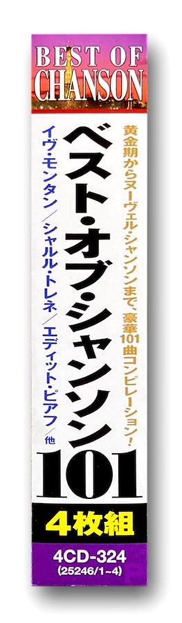 ディスク 11. 枯葉 / イヴ・モンタン2. 去り行く君 / シャルル・トレネ3. わが愛するパリ / モーリス・シュバリエ4. パリの悪戯っ子 / イヴ・モンタン5. 谷間に三つの鐘が鳴る / エディット・ピアフ6. いつか戻り来る人 / ジョルジュ・ムスタキ7. 二人の友達 / エディット・ピアフ8. マラディ・ダムール 恋の病 / アンリ・サルヴァドール9. ラ・ムール / レオ・フェレ10. ひまわり / イヴ・モンタン11. パリの花 / モーリス・シュバリエ12. ドミノ / アンドレ・クラヴォー13. ナントの囚人 / エディット・ピアフ14. 想い出のランデヴー / ダリダ15. 僕の自由 / ジョルジュ・ムスタキ16. 小さな男 / エディット・ピアフ17. 可愛いおチビさん / リーヌ・ルノー18. もし君が帰ってくるなら / レダ・ケール19. 小さなひなげしのように / ムルージ20. そのおかげで / エディット・ピアフ21. 白いバラ / ティノ・ロッシ22. ヴァランティーヌ / モーリス・シュバリエ23. ある恋の物語 / エディット・ピアフ24. 狂気 / ジョルジュ・ムスタキ25. わが心のアランフェス / リシャール・アントニーディスク 21. 愛の讃歌 / エディット・ピアフ2. 聞かせてよ愛の言葉を / リュシエンヌ・ボワイエ3. 真夜中の居酒屋 / ダミア4. 可愛い花 / アニー・グールド5. かわいいトンキン娘 / ジョセフィン・ベーカー6. 変わらぬパリ / ジャン・サブロン7. サラ / ジョルジュ・ムスタキ8. チン・チン / リシャール・アントニー9. 待ちましょう / リナ・ケッティ10 あたいはパリッ子 / ミスタンゲット11. 私の孤独 / ジョルジュ・ムスタキ12. 海賊の歌 / エディット・ピアフ13. 君去りし日 / ジョルジュ・ムスタキ14. クロパン・クロパン / イヴ・モンタン15. パリのロマンス / シャルル・トレネ16. 喜びあり / モーリス・シュバリエ17. パリのフラメンコ / イヴ・モンタン18. 生きる時代 / ジョルジュ・ムスタキ19. 狂うほど女がすき / ティノ・ロッシ20. ピギャール / ジョルジュ・ユルメール21. 知らず知らずに / ルネ・ルバ22. 青色のジャヴァ / フレエル23. おいら / モーリス・シュバリエ24. サン・ジャンの私の恋人 / リュシエンヌ・ドリール25. バンビーノ / ダリダ26 はかない青春 / ベルト・シルヴァディスク 31. ムーランルージュの歌 / リーヌ・ルノー2. 暗い日曜日 / ダミア3. パリの空の下 / ジュリエット・グレコ4. 雨傘とマント / リナ・ケッティ5. セ・シ・ボン / イヴ・モンタン6. ヌ・ヴリオン 望み / ジョルジュ・ムスタキ7. 水の畔を歩いてみれば / ジャン・ギャバン8. パリのお孃さん マドモワゼル・ド・パリ / ジャクリーヌ・フランソワ9. 土曜の夜の小さな踊り場 / ジョルジュ・ゲタリ10. サンジェルマン・デ・プレ / レオ・フェレ11. ヴィエニ・ヴィエニ / ティノ・ロッシ12. 生命にかけて / シャルル・アズナヴール13. アモール・モン・シェール・アモール / イヴ・モンタン14. 残されし恋には / シャルル・トレネ15. ミラボー橋 / レオ・フェレ16. 私のいい人 私の男 / パタシュー17. 恋はスミレの花束 / ルイス・マリアーノ18. いつの日か / ムルージ19. 私は気にしない / エデイット・ピアフ20. 異国の人 / ジョルジュ・ムスタキ21. ベンチの恋人達 / ジョルジュ・ブラッサンス22. ルナ・パーク / イヴ・モンタン23. ビッシュ・マ・ビッシュ / フランク・アラモ24. ゴンドリエ / ダリダ25. パリ・カナイユ パリ野郎 / カトリーヌ・ソヴァージュディスク 41. バラ色の人生 / エディット・ピアフ2 あじさい娘 / イベット・ジロー3. パリ変わらぬパリ / モーリス・シュヴァリエ4. 日曜はきらい / ジュリエット・グレコ5. もう遅すぎる / ジョルジュ・ムスタキ6. 愛の喜び / ティノ・ロッシ7. 恋人たちはどこに / フレエル8. さよなら恋人 / エディット・ピアフ9. 二人は恋人 / ジルベール・ベコー10. プチ・パパ・ノエル / ティノ・ロッシ11. 悲しみの庭 / ジョルジュ・ムスタキ12. 優しきフランス / シャルル・トレネ13. 愛しあう子供たち / ジュリエット・グレコ14. マリネラ / ティノ・ロッシ15. 美しき果物サンギーヌ / イヴ・モンタン16. パリの恋人達 / エディット・ピアフ17. 私の心はヴァイオリン / リュシエンヌ・ボワイエ18. あの娘を知っていたら / モーリス・シュバリエ19. おゝ、コルシカよ愛の島 / ティノ・ロッシ20. 旅芸人のバラード / ジルベール・ベコー21. パリで / イヴ・モンタン22. パダン・パダン / エディット・ピアフ23. そのつもりでも / ジュリエット・グレコ24. 愛しかない時 / ダリダ25. 街に歌が流れていた / エディット・ピアフ