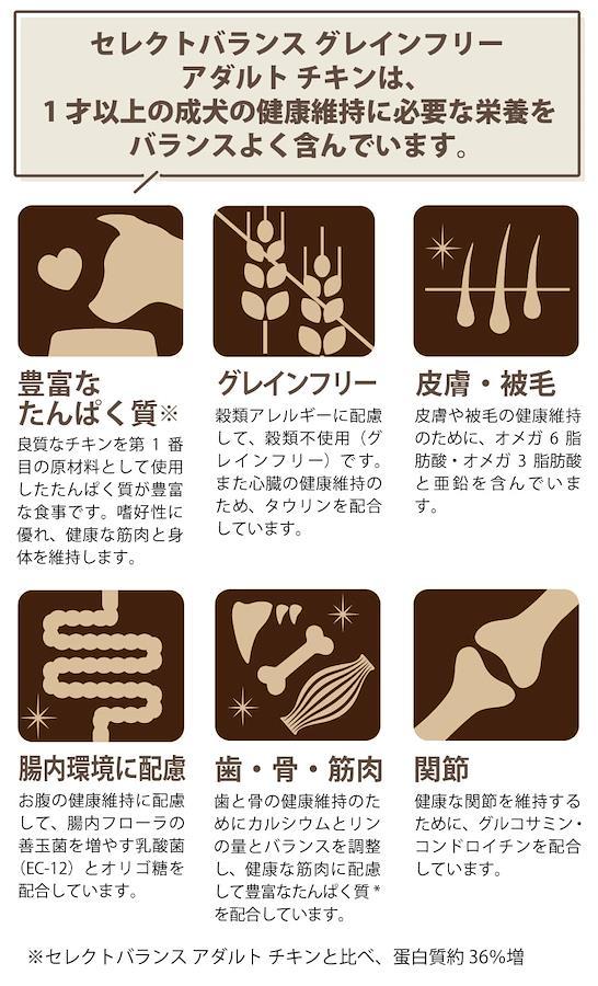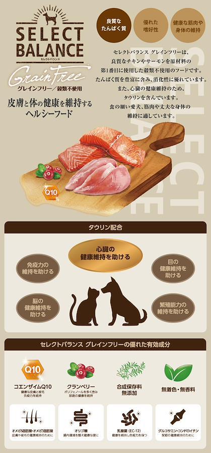 セレクトバランス グレインフリーは良質なチキンを原材料の1番目に使用した高たんぱくのフードです。品質だけでなく、たんぱく質の量も既存の穀物を使用している代表的なプレミアムフードと比較して高くなっています。また、心臓の健康維持のため、タウリンを含んでいます。食の細い愛犬、筋肉や丈夫な身体の維持に適しています。
