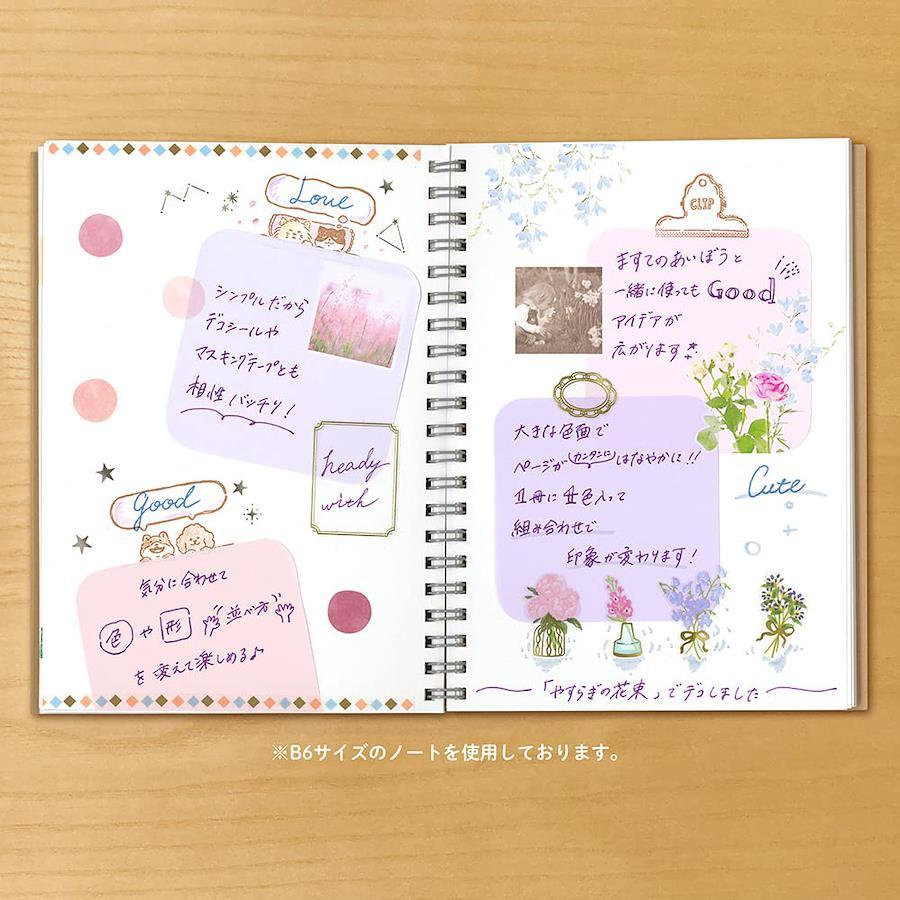 【まるみのあるカラーとカタチ。やさしく伝わるふせん】「まるみの」はシンプルで使いやすく、手帳に使ってもおしゃれにまとまるふせんです!情景をイメージさせるテーマカラー4色が1冊になって、好きな色から使えます。手帳デコでは、貼るだけで簡単におしゃれなデコができます。色の組合せ × 形の組合せ × 手持ちのシールやはんこで多彩なデコが楽しめます!自分使いはもちろん、相手使いも。おうちで・オフィスで・学校でもシーンを選ばず使える!使い勝手が良くやさしく伝わるふせんです。