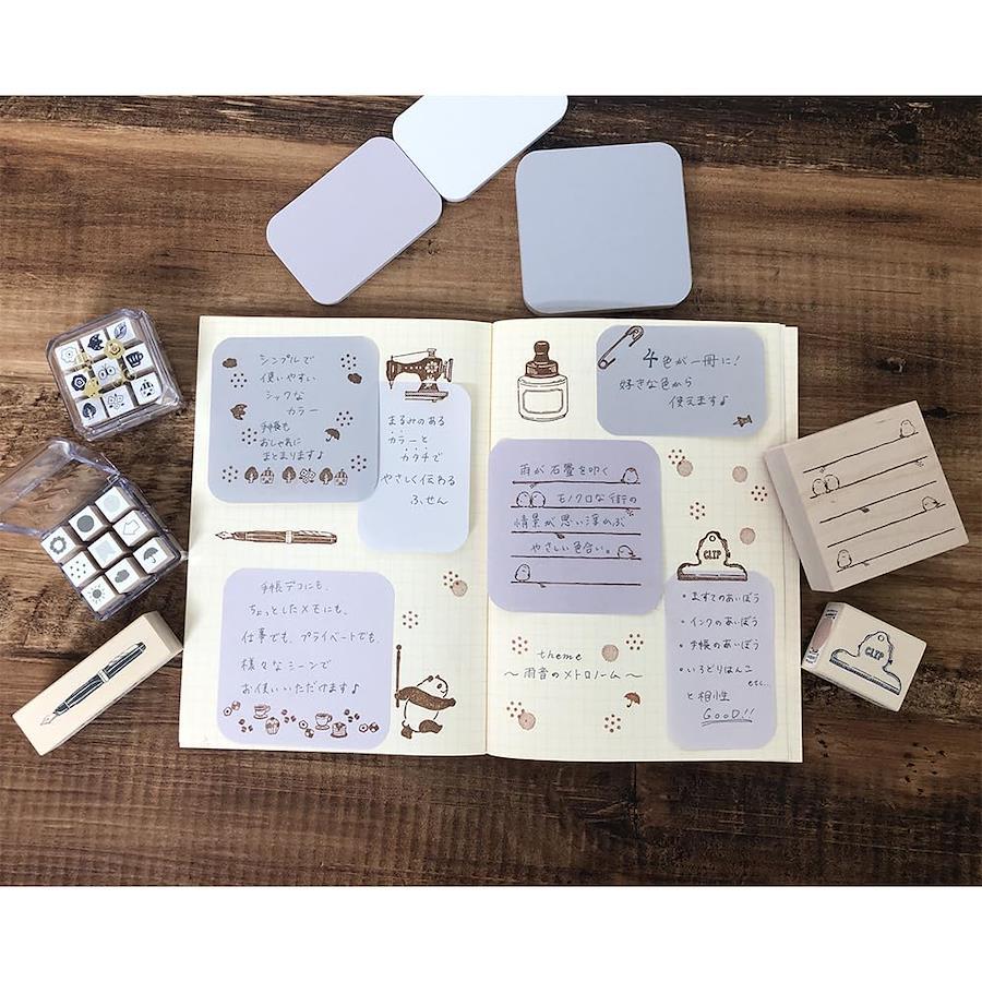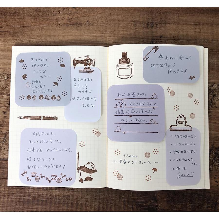 「まるみの」はシンプルで使いやすく、手帳に使ってもおしゃれにまとまるふせんです!情景をイメージさせるテーマカラー4色が1冊になって、好きな色から使えます。手帳デコでは、貼るだけで簡単におしゃれなデコができます。色の組合せ × 形の組合せ × 手持ちのシールやはんこで多彩なデコが楽しめます!自分使いはもちろん、相手使いも。おうちで・オフィスで・学校でもシーンを選ばず使える!使い勝手が良くやさしく伝わるふせんです。