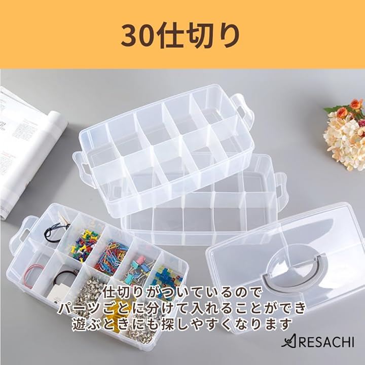 仕切りがついているので、パーツごとに分けて入れることができ、遊ぶときにも探しやすくなります。