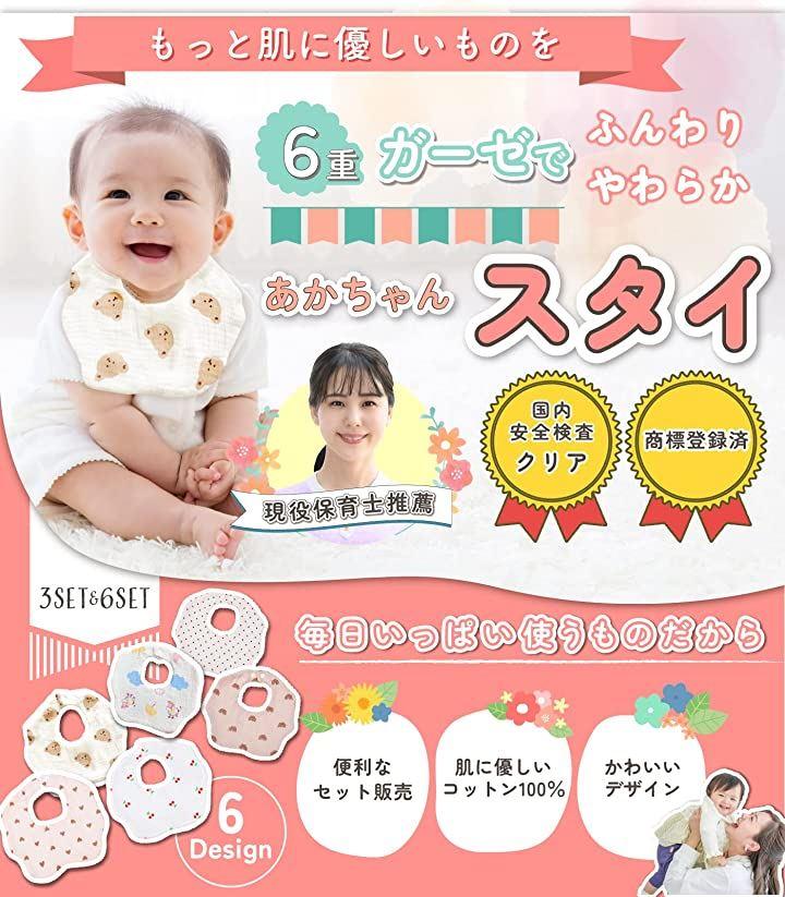 ・「通気性・吸水性*」 6重ガーゼでよだれや汚れを早く吸収し、服が汚れる心配もありません。