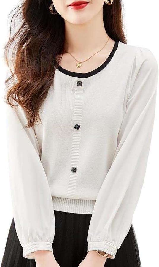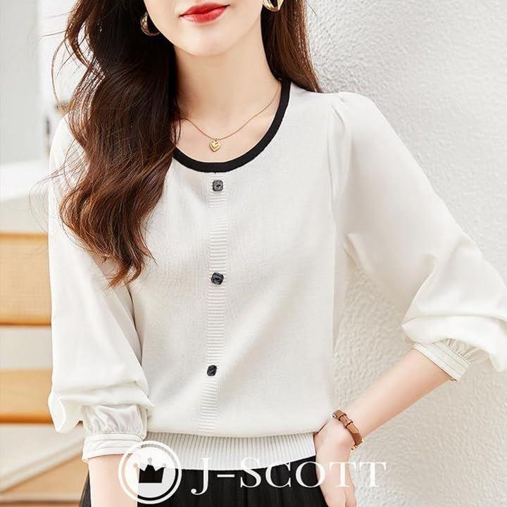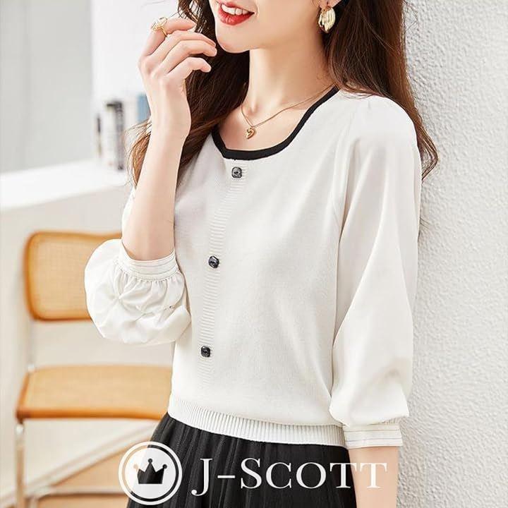 ふわりとしたフェミニンなパフスリーブに、身頃のシンプルなバイカラーニットが品の良い1枚。