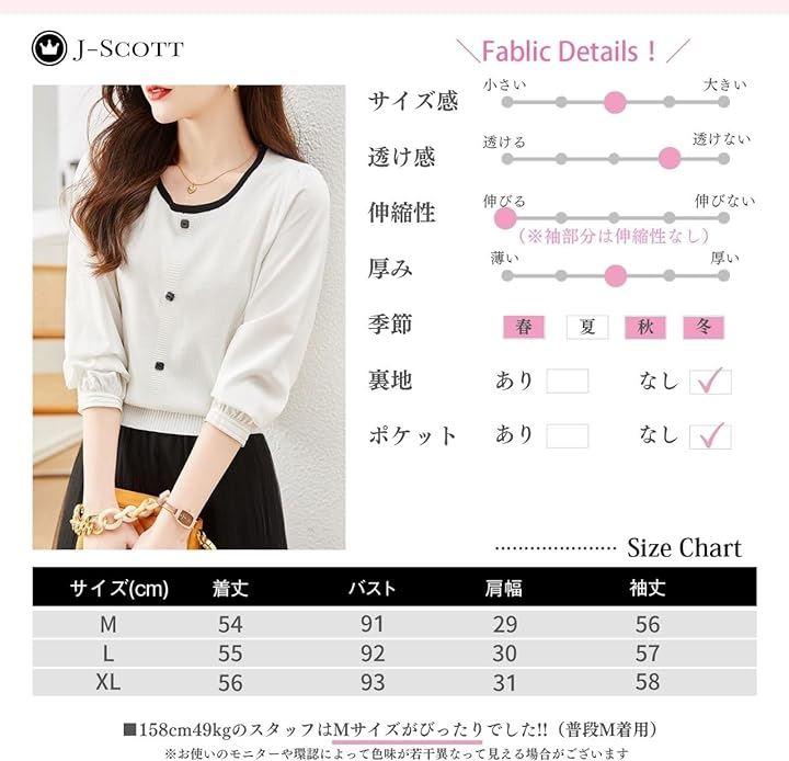 着丈/バスト/肩幅/袖丈 M: 54/91/29/56 L: 55/92/30/57 XL: 56/93/31/58 *158cm/49kgのスタッフの場合:Mがジャストサイズでした(普段M着用)