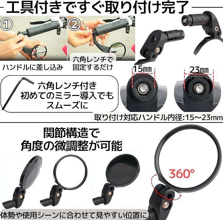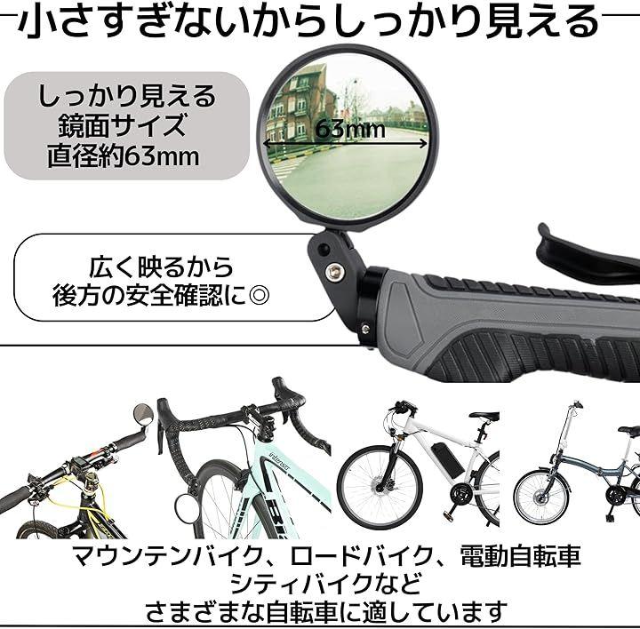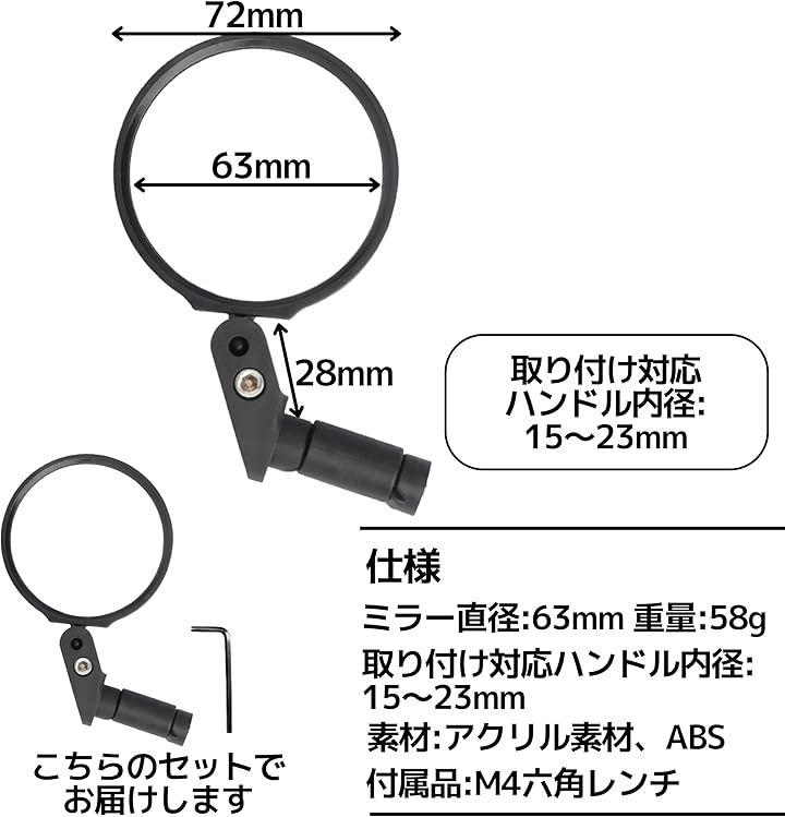「仕様」 サイズ:ミラー直径:63mm、重量58g、取り付け対応ハンドル内径:15~23mm 取付方式:バーエンド差し込み固定 素材: アクリル素材、ABS 付属品:六角レンチ 対応目安:一般的なバーエンド付きハンドル(形状や内径により適合しない場合があります) 用途:ロードバイク/クロスバイク/シティサイクル等