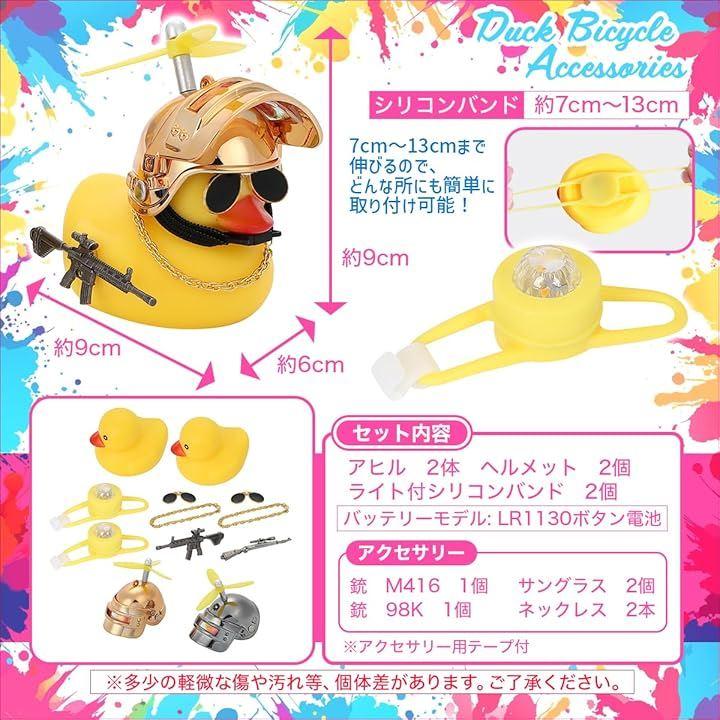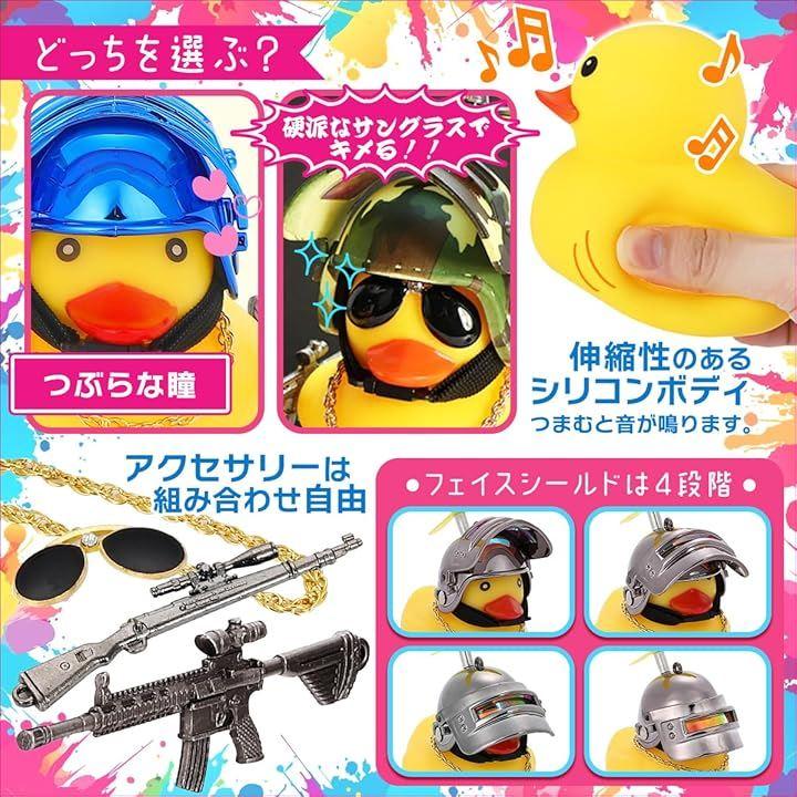 「セット内容」アヒル2体、ヘルメット2個、ライト付きシリコンバンド2個、アクセサリー(銃モデルM416x1、98Kx1、サングラスx2、ネックレスx2本、アクセサリーテープ付)「サイズ」アヒル:約9cmx6cmx9cm