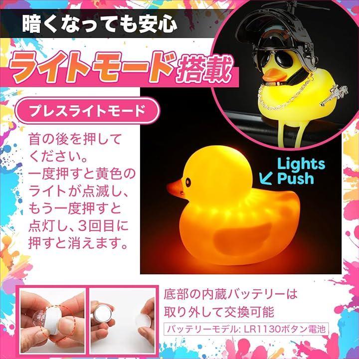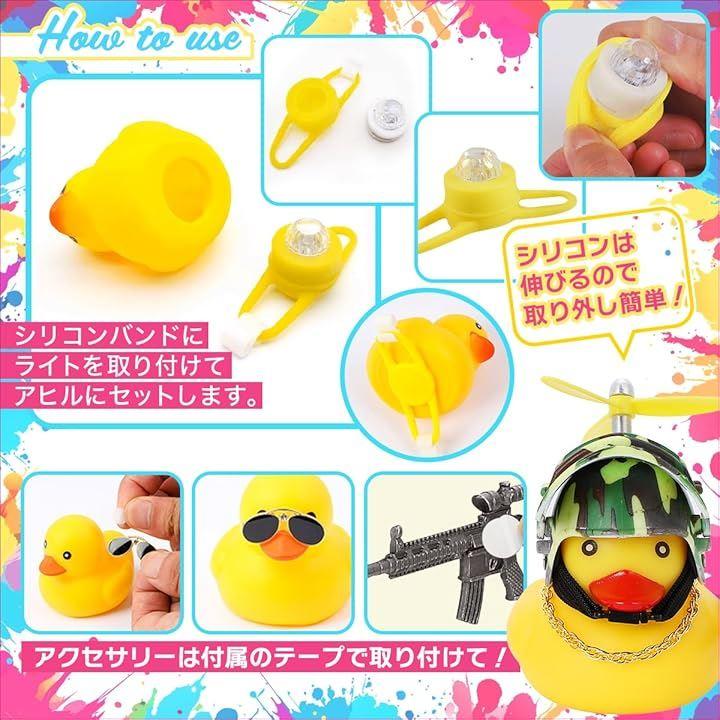 可愛さと実用性を兼ね備えたアヒル型ライト 小さな黄色いアヒルが、プロペラ付きヘルメットやサングラスを装着したユニークなデザインで登場。自転車やベビーカー、車の飾りとしてだけでなく、実用性も抜群。