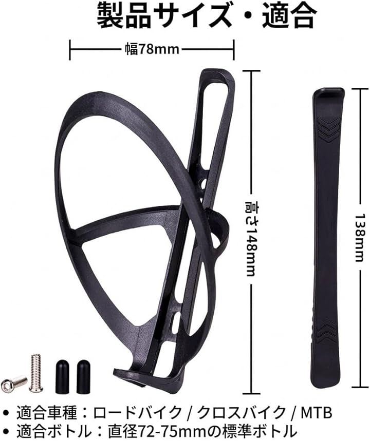 「製品仕様・適合」 サイズ:高さ148mmx幅78mm / 重量:約34g / 材質:高耐久樹脂 / 付属品:取り付け用ボルト(ステンレスネジ)2本 / 適合車種:一般的なボトルケージ台座のあるロードバイク、クロスバイク、MTBなど / 適合ボトル:直径72-75mmの標準的なサイクルボトル