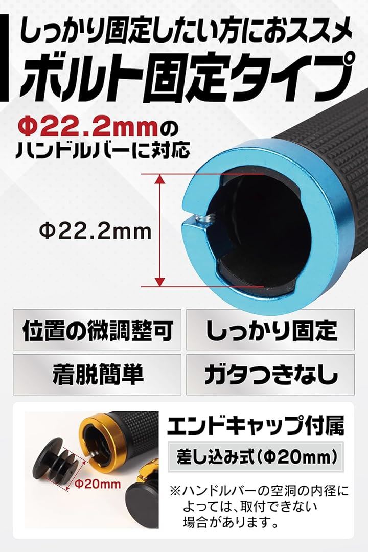 本体寸法(約):長さ127mm/内径22.2mm質量(約):156g(左右計)材質:ラバー、アルミ*手のひらに快適のフィット感 ・汗をかいてもすべりにくく、しっかりと握れる凹凸グリップすべり止め設計やグリップが柔らかいため手の負担が軽減。