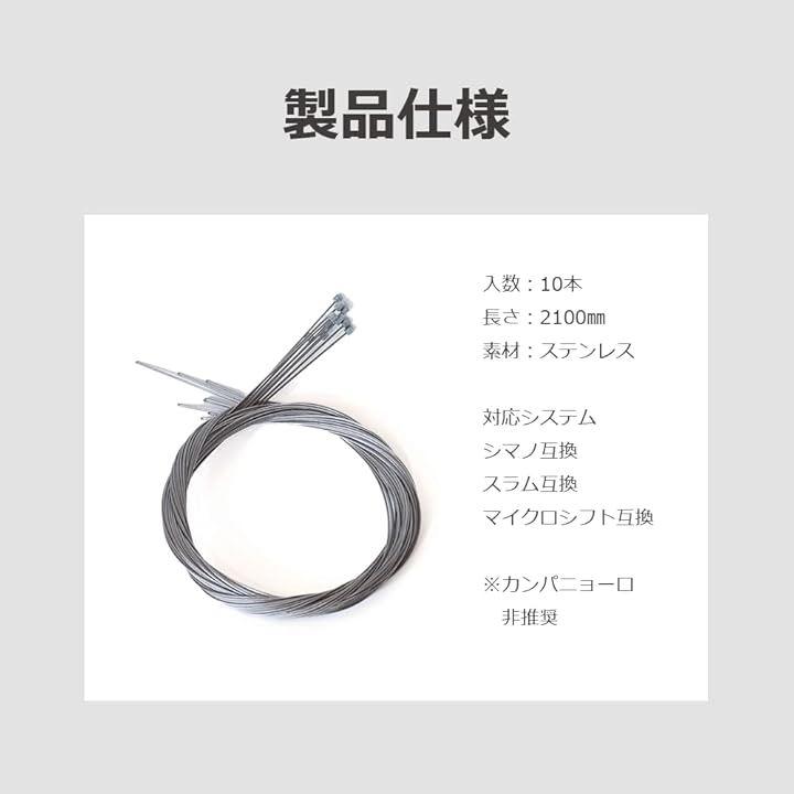 「本体仕様」素材:ステンレス 適合:シマノ/スラム互換シフトワイヤー(カンパニョーロ非推奨)*内装変速には対応しません 長さ:2100mm 10本入り
