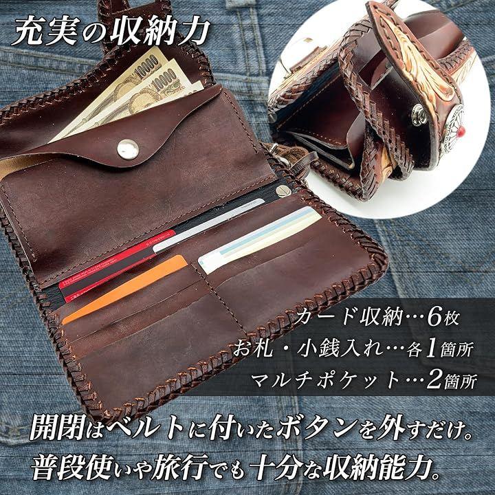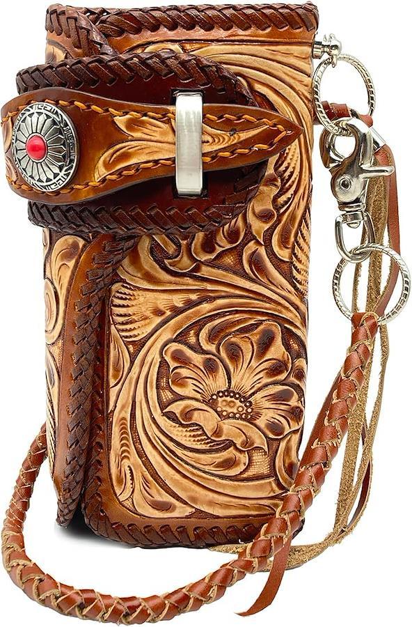 「美しい手彫りの模様」革素材の持つ風合いを活かしたバイカーズウォレット。