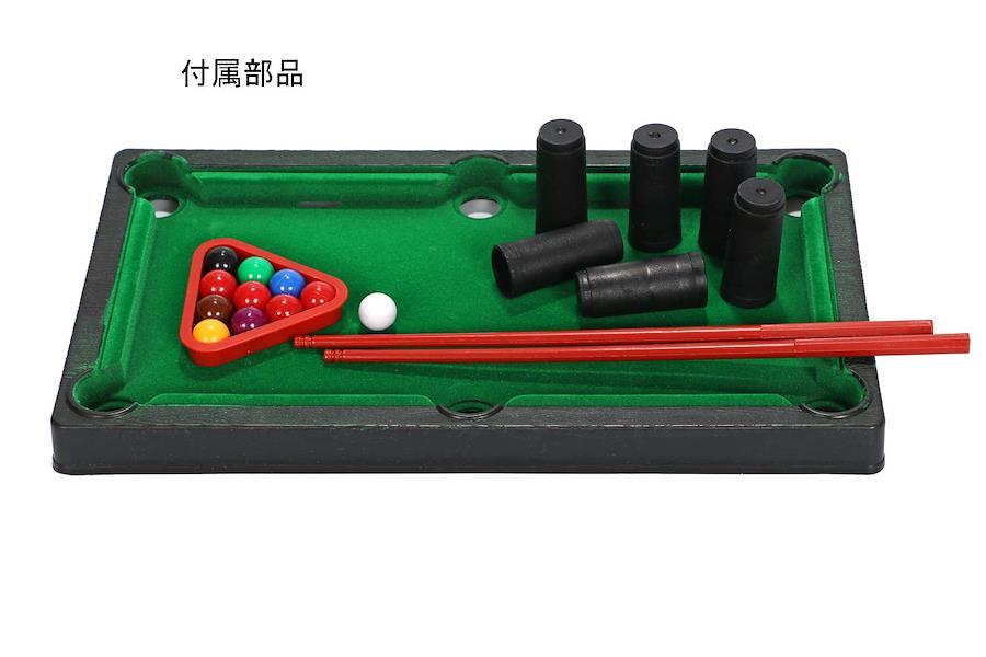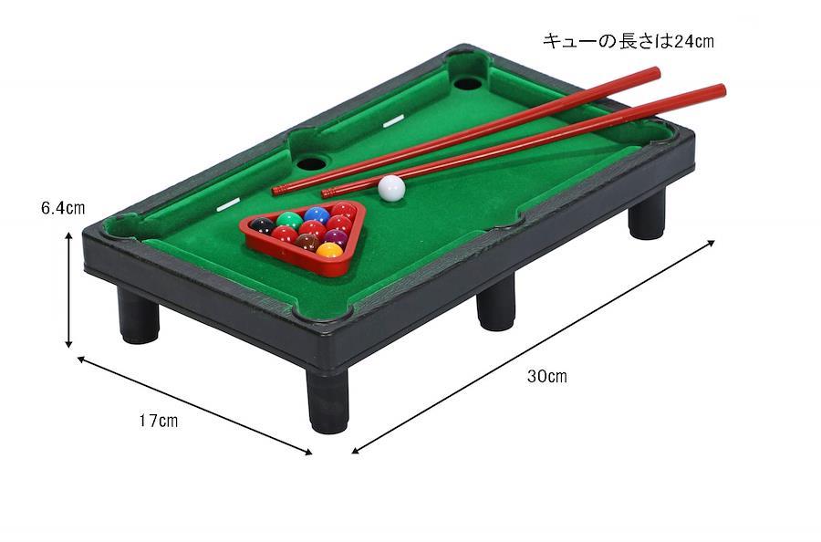 サイズ:縦30㎝ 横17㎝ 高さ6.4㎝ 素材:ABS樹脂と盤上はフェルトです。 重さ:245g 適用:ミニサイズなので場所をとらず卓上で遊べます。キューの長さは24㎝です。 備考:パーティーゲーム、テーブルゲーム。