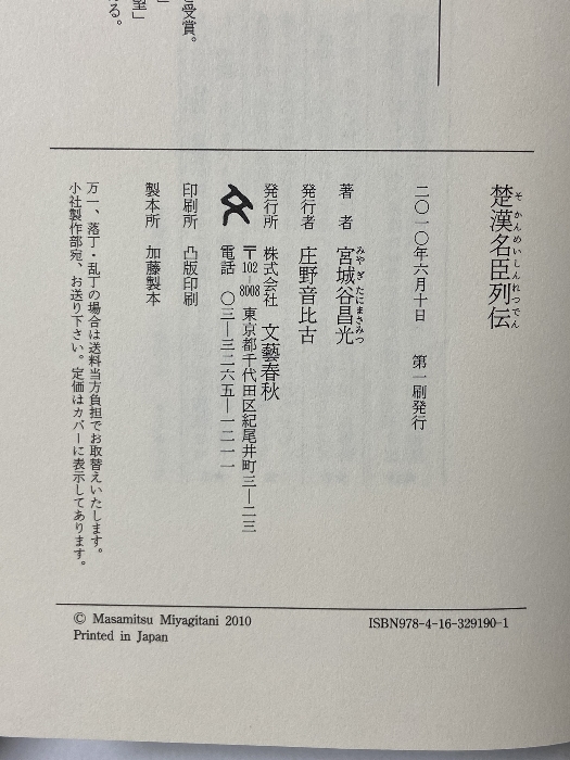 Biography of famous retainers of the Chu Han, Bungeishunju, Masamitsu Miyagidani