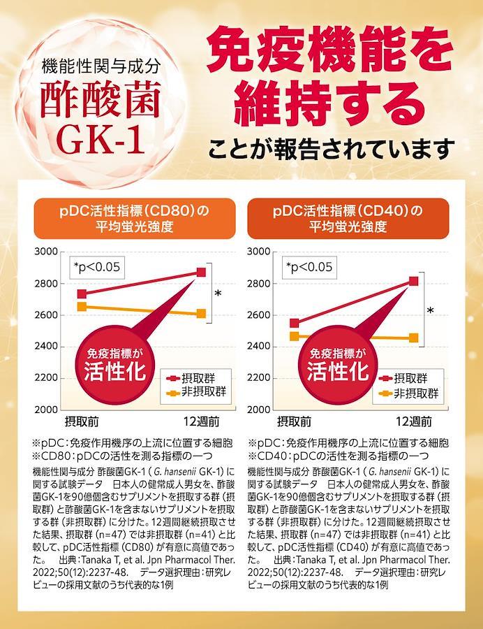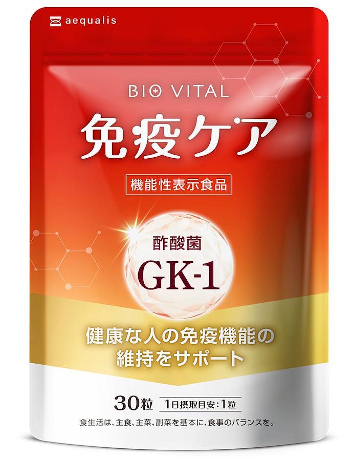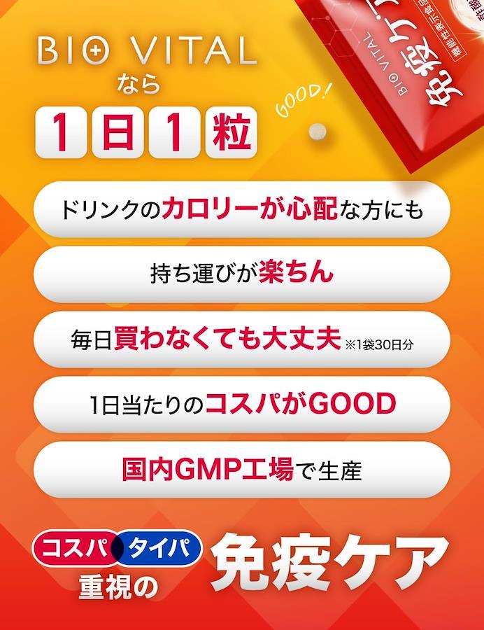 ■サイズ:??21x14.8x0.7cm;20g免疫ケアの新定番「BIOVITAL(ビオバイタル)」で、季節の変わり目でも崩さない健康な毎日を作っていきましょう。 BIOVITAL(ビオバイタル)には、pDC(プラズマサイトイド樹状細胞)に働きかけ、健康な人の免疫機能の維持に役立つ酢酸菌GK-1が含まれた機能性表示食品です。(届出番号:I1006) さらに健康力を維持する乳酸菌「シールド乳酸菌」を100億個(1粒あたり)配合。Wの菌のパワーであなたの健康をサポートします。 そして、滋養源である甘草エキス、高麗人参末、ショウガ末、桂皮末、陳皮末、棗抽出物を配合。 崩さないためのビタミンCをはじめとするマルチビタミン、そして緑茶由来のカテキンでとことんあなたを強くします。 「年のせいか調子の波がある」「週末の旅行のために体調を保ちたい」「家族のためにハツラツでいたい」「仲間のために仕事を休むわけにはいかない」 自分のために、家族や仲間のため、免疫ケアしたい方を徹底サポートします。 免疫機能の維持に役立つ酢酸菌GK-1を配合した機能性表示食品 健康力を維持するためのシールド乳酸菌を100億個配合/1粒あたり 甘草エキスや高麗人参、ショウガなど滋養源であなたを強くする ビタミンCをはじめとするマルチビタミンで健康を維持 抗酸化力に優れたカテキンが外の見えない脅威からもプロテクト ■重要なお知らせ原材料・成分酢酸菌加工品(マルチトール、酢酸菌加工品)(国内製造)、難消化性デキストリン、乳酸菌乾燥粉末(殺菌)(デキストリン、乳酸菌乾燥原末)、還元麦芽糖水飴、ビタミンE含有植物油、緑茶抽出物、高麗人参末、ショウガ末、チンピ末、ケイヒ末、甘草エキス末、ナツメ抽出物(デキストリン、ナツメエキス)/ビタミンC、セルロース、加工澱粉、ステアリン酸カルシウム、二酸化ケイ素、HPC、ビタミンB6、ビタミンA、ビタミンB2、ビタミンB1、ラクトフェリン(乳由来)、微結晶セルロース、ビタミンD