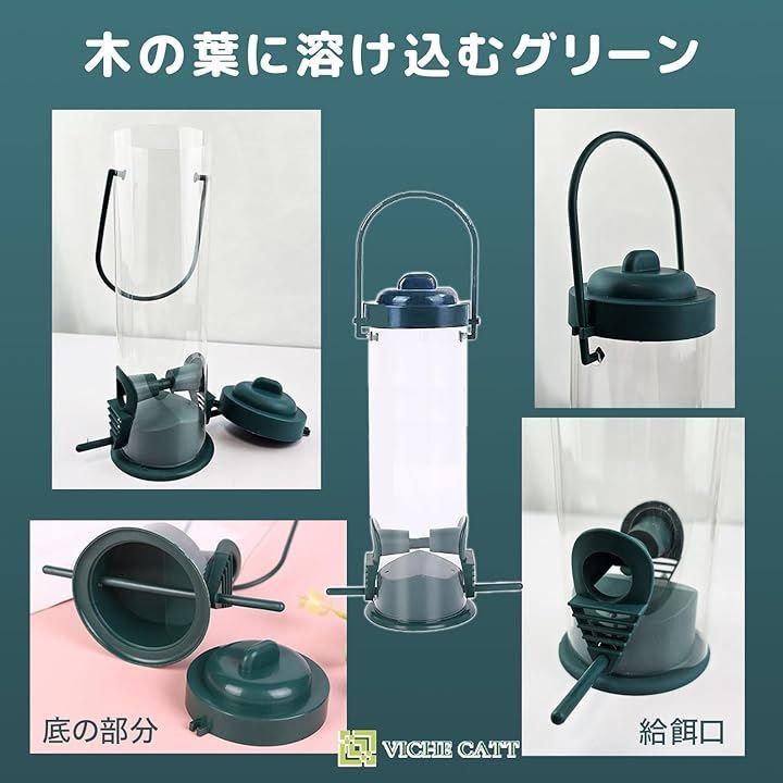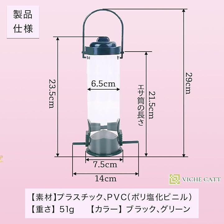 「サイズ」取っ手部分を含めた全長:29cm 、底面の直径:7.5cm、フタを含めたえさ筒の長さ:23.5cm、えさ筒の長さ:21.5cm、えさ筒の直径:6.5cm 、とまり木の長さ:14cm「重さ」51g「素材」プラスチック、PVC(ポリ塩化ビニル)、「カラー」ブラック、グリーン