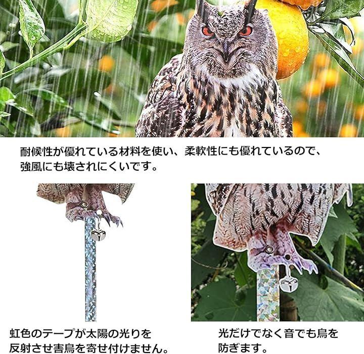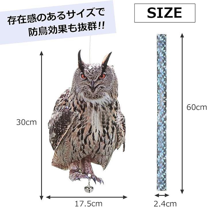鳥よけリアルフクロウ、本体:長さ30x幅17.5x厚さ0.3cm、アクリル、鈴付き、ホログラムテープ:長さ60x幅2.4cm*モニターの環境により、色の見え方に若干差が生じる場合がございます。
