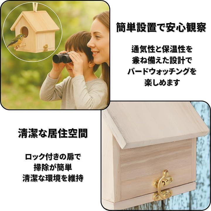 「簡単設置で安心観察」吊り下げ用のひもと固定ネジが付属し、木や壁にしっかり固定できます。