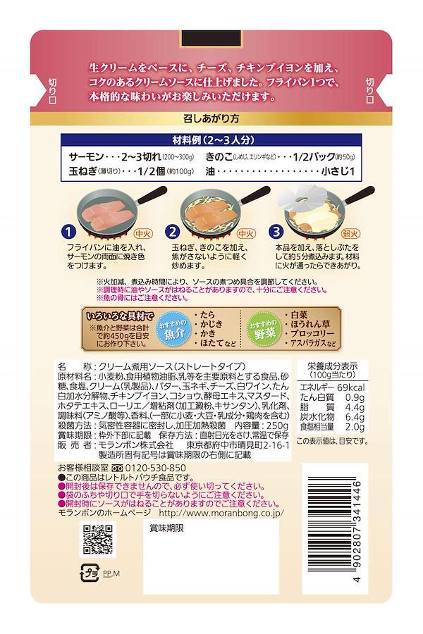 子供も大人も満足できる、ビストロ仕立てのサーモンクリーム煮用ソースです。生クリームをベースに、チーズ、チキンブイヨンを加えた、コクのあるクリームソースに仕上げました。クリームチーズ、ほたてだしを加えたコクのあるソースでおかずにもなるしっかりとした味わいです。フライパン1つで本格的な味わいがご家庭で楽しめます。サーモン以外にかじき、たら、ほたて、かきなどでもおいしくめしあがれます。