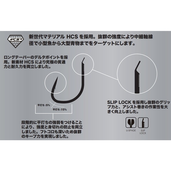 触れたら即掛け !! 抜群の初期掛かりをパワーロスなく貫通!近海青物をベースに開発した先鋭速攻デザインのジギングフック!・近海青物をベースに開発した先鋭速攻デザインのジギングフック。・触れれば即掛け、一瞬のコンタクトを逃さない LONG TAPER & DELTA POINT!・次世代新素材 HCS を採用、更に BKK 独自の SPECIAL FORGING により圧倒的な強度とファイト時のキープ力を実現。・BKK のテクノロジーを集約した JAPAN STANDARD FASTHOOK が誕生しました。・HCS の効果により、フッキング時にパワーロスなく真っ直ぐ深く貫通します。 サイズ:#1 入数:2本 ソリッドリング:4# コード:フロロカーボンコア 100lb. ※実物と色が違って見える場合があります。あらかじめご了承下さい。