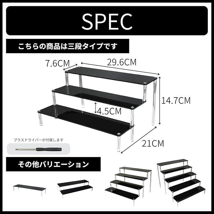 「サイズ」一段:横幅29.6cmx奥行7.6cmx高さ4.8cm、 二段:横幅29.6cmx奥行14cmx高さ9.8cm、 三段:横幅29.6cmx奥行21cmx高さ14.7cm、 四段:横幅29.6cmx奥行26.5cmx高さ19.7cm、 五段:横幅29.6cmx奥行34.5cmx高さ24.8cm 「付属品」プラスドライバー
