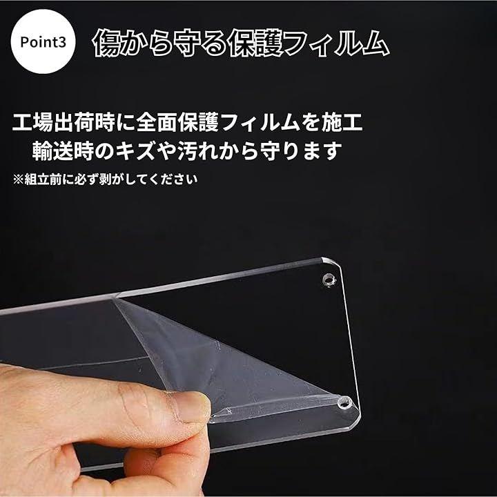 アクリル製の棚板と脚パーツの両面には、工場出荷時に保護フィルムが貼付されています。