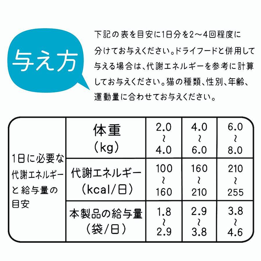 体重2kg: 2袋/日、体重3kg: 2.5袋/日. 体重4kg:3袋を目安に2-3回程度に分けてお与えください。