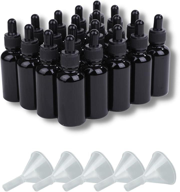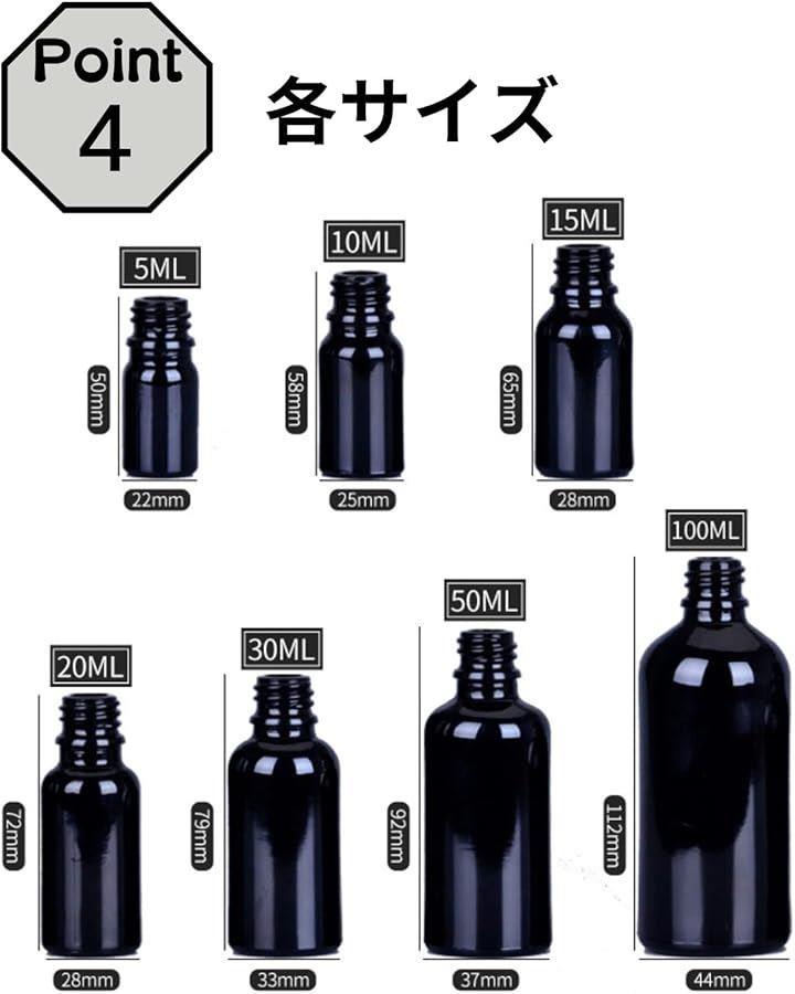 「商品詳細」容量:5ml (ボトル直径22mmxボトル高さ50mm) / 10ml (ボトル直径25mmxボトル高さ58mm) / 15ml (ボトル直径28mmxボトル高さ65mm) / 20ml (ボトル直径28mmxボトル高さ72mm) / 30ml (ボトル直径33mmxボトル高さ79mm)、本体:20本、漏斗(PP製):5個
