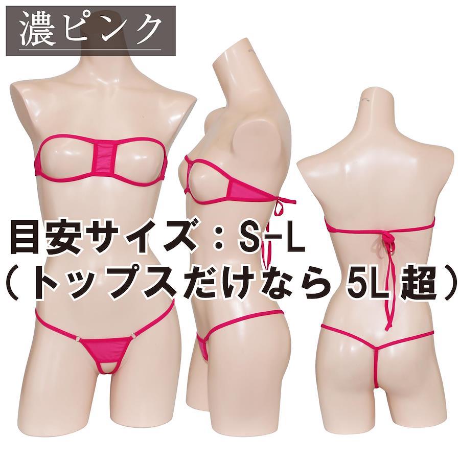 原産国 中国【特徴】オープンカップになっている、カップレスのメガネビキニのマイクロビキニ。胸も股間も穴あきの、過激な水着。肩ひものないストラップレスのチューブトップタイプなので、肌の露出も多くセクシー。もちろん、Tバック。【素材】ポリエステル、その他【目安サイズ】S-L ※ トップスだけなら5L超え【トップス】アンダーバスト最大170cm、ウエスト56-88cm、ヒップ104cm、着丈(バスト上部から下部まで)6.5cm 【ボトムス】ウエスト56-88cm、ヒップ最大104cm、股上13cm【備考】Mサイズで結ぶ場合、バストヒモは平置き30cmの長さ(アンダーバスト60cm)で結ぶとちょうどいいくらい。 【商標登録番号】登録5745978(#lf)(#lf)(#lf)商品購入前に、ストア紹介ページをご確認ください。