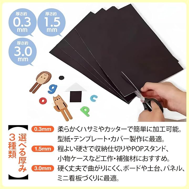 厚さは0.3mm、1.5mm、3.0mmの3種類から選べ、10枚セットでご用意。