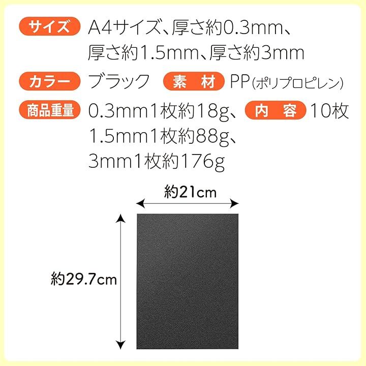 「サイズ」 A4サイズ、厚さ約0.3mm 「カラー」 ブラック 「素材」 PP(ポリプロピレン) 「商品重量」 1枚約18g 「内容」 10枚