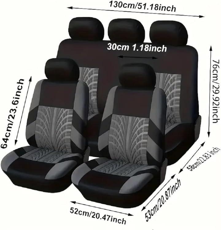 「商品仕様」 *セット内容:ヘッドレストカバーx 5、フロントシートカバーx 2、リアベンチシートカバー x 1、リアバックレストシートカバー x 1 *サイズ:ヘッドレストカバー(30cmx27cm)、フロントシートカバー(118cmx56cm)、リアベンチシートカバー(132cmx55cm)、リアバックレストシートカバー(132cmx64cm) 「適合確認・注意事項」 *フロントシート 取り外し可能ヘッドレスト、取り外し可能サイドアーム *リアシート ヘッドレストが取り外せるタイプのみ対応します。