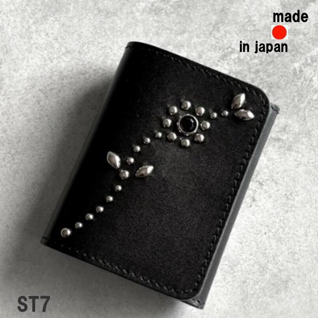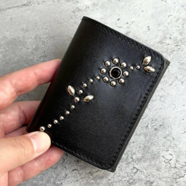 【サイズ】多少の前後、誤差、ご了承下さいませ。サイズ:10.5×8.5×厚み2.5(cm)容量:札12枚程度・カード10枚■生産地:日本■素材・成分:本体:牛革(栃木レザー)スタッズ:真鍮(アメリカ製)