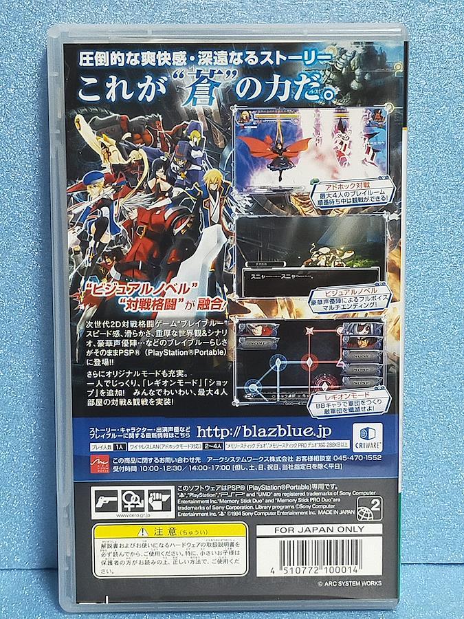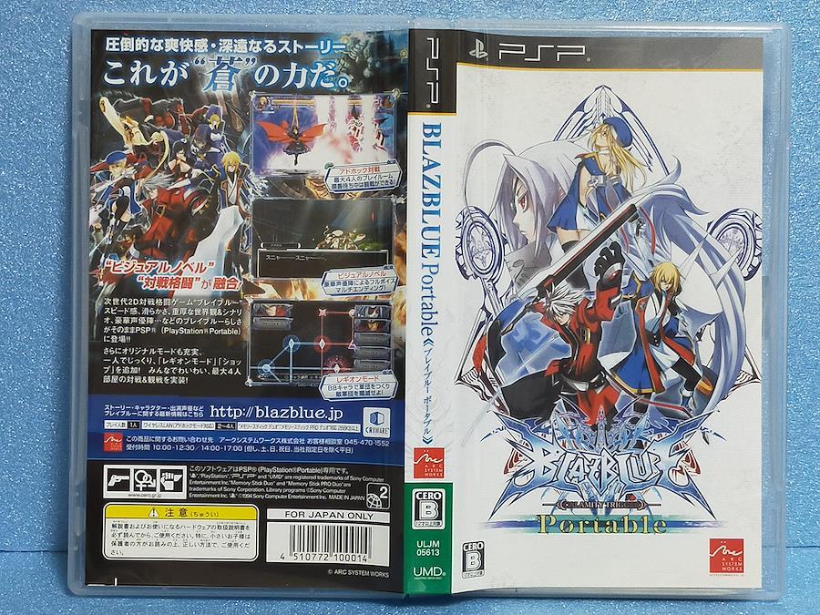 人気格闘ACT『ギルティギア ゼクス』シリーズを手掛けたスタッフによる2D対戦格闘ゲーム『ブレイブルー』を、PS3とXbox 360に続いてPSPにパワーアップ移植! PS3版とXbox 360版では4人しか登場しなかったUnlimitedキャラクターが12人に増えたほか、多彩な新モードが追加されている。新モード"レギオンモード"は、マップ内に多数存在する敵軍を撃破し、マップを制覇していくというもの。敵軍を全滅させたあとは、敵軍から1名を仲間にすることで自軍を強化できる。アドホック通信機能を利用した新モード"ネットワークモード"では、参加プレイヤー2~4人で順番に1対1の対戦プレイが可能(対戦待ち中は自分のPSPで観戦が可能)。対戦時は、参加プレイヤー1人につき1台のPSPとソフトが必要となるが、ソフトはUMD版とDL版のどちらでもOKとなっている。