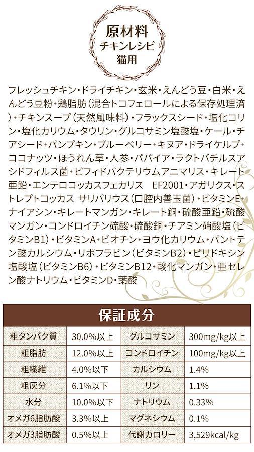 フレッシュチキン・ドライチキン・玄米・えんどう豆・白米・えんどう豆粉・鶏脂肪(混合トコフェロールによる保存処理済)・チキンスープ(天然風味料)・フラックスシード・塩化コリン・塩化カリウム・タウリン・グルコサミン塩酸塩・ケール・チアシード・パンプキン・ブルーベリー・キヌア・ドライケルプ・ココナッツ・ほうれん草・人参・パパイア・ラクトバチルスアシドフィルス菌・ビフィドバクテリウムアニマリス・キレート亜鉛・エンテロコッカスフェカリスEF2001・アガリクス・ストレプトコッカスサリバリウスK12(口腔内善玉菌)・ビタミンE・ナイアシン・キレートマンガン・キレート銅・硫酸亜鉛・硫酸マンガン・コンドロイチン硫酸・硫酸銅・チアミン硝酸塩(ビタミンB1)・ビタミンA・ビオチン・ヨウ化カリウム・パントテン酸カルシウム・リボフラビン(ビタミンB2)・ピリドキシン塩酸塩(ビタミンB6)・ビタミンB12・酸化マンガン・亜セレン酸ナトリウム・ビタミンD・葉酸