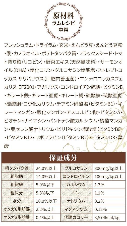 ラム・ラムミール・玄米・えんどう豆・えんどう豆粉・黍・カノラオイル・ポテトタンパク質・フラックスシード・トマト搾り粕(リコピン)・野菜エキス(天然風味料)・サーモンオイル(DHA)・塩化コリン・グルコサミン塩酸塩・ストレプトコッカス サリバリウス(口腔内善玉菌)・エンテロコッカスフェカリスEF2001・アガリクス・コンドロイチン硫酸・ビタミンE・キレート鉄・キレート亜鉛・キレート銅・硫酸鉄・硫酸亜鉛・硫酸銅・ヨウ化カリウム・チアミン硝酸塩(ビタミンB1)・キレートマンガン・酸化マンガン・アスコルビン酸・ビタミンA・ビオチン・ナイアシン・パントテン酸カルシウム・硫酸マンガン・亜セレン酸ナトリウム・ピリドキシン塩酸塩(ビタミンB6)・ビタミンB12・リボフラビン(ビタミンB2)・ビタミンD3・葉酸