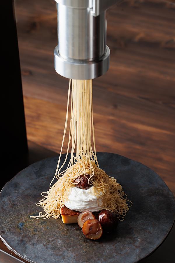 A Mont Blanc dessert covered with chestnut cream using a Mont Deco machine.