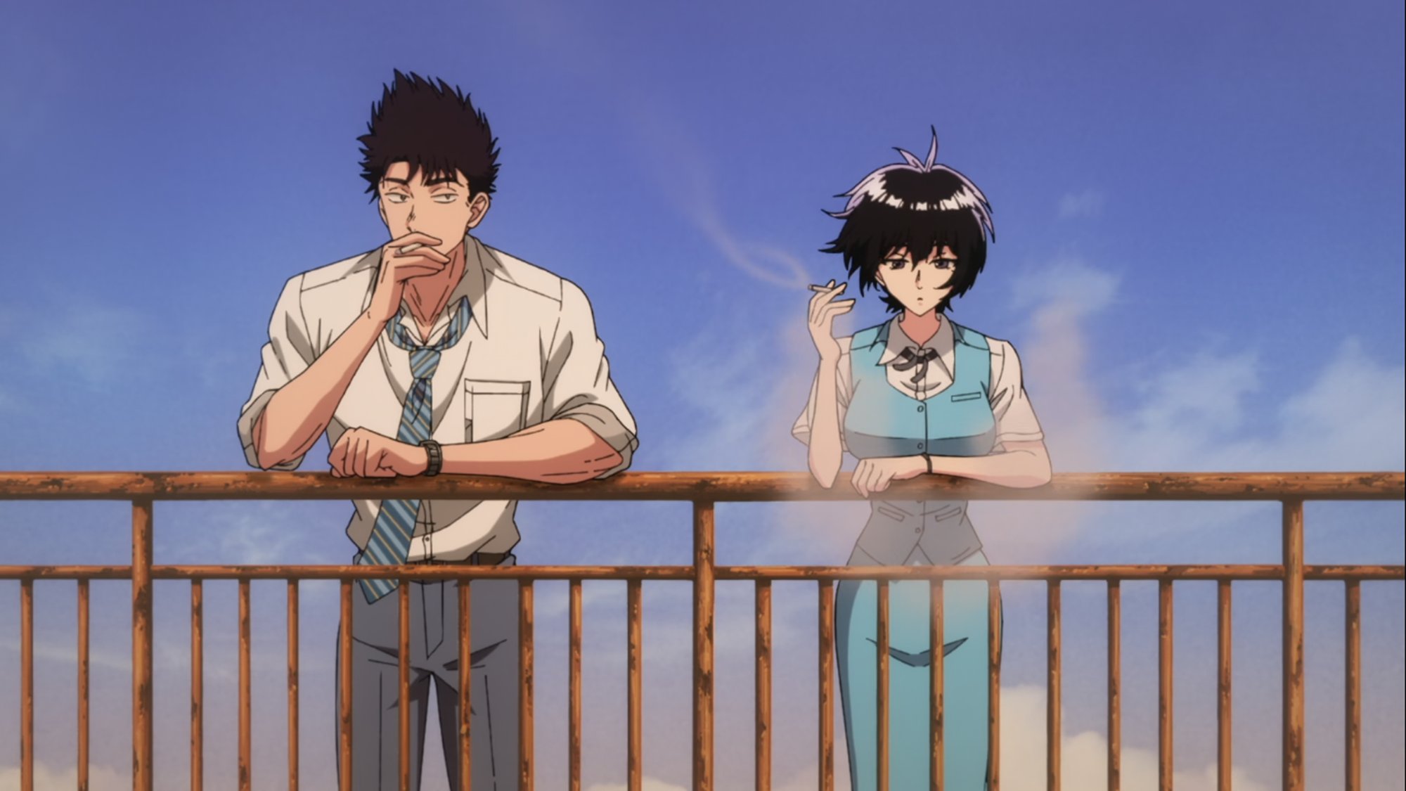 Reiko and Kudou usually take a smoke on the rooftop of their workplace.